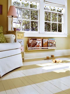 Need to get rid of bad carpet or linoleum but can't afford new flooring? Paint your floors! It takes a little work, but will only cost you a can of paint. With durable options like Benjamin Moore deck paint, it will outlast even the heaviest traffic. If you are lucky enough to have plank flooring, you can achieve a great cottage feel. But even the normal plywood subfloor boards painted out can look amazing.